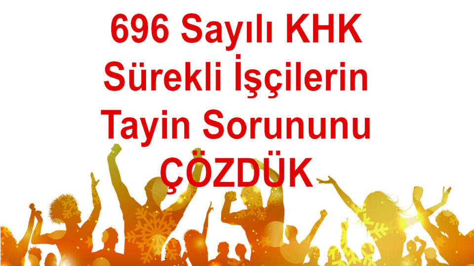 Tayin hakkı bulunmayan 696 Sayılı KHK ile istihdam edilen işçilerin tayin haklarıyla ilgili geçen senenin başından beri yürüttüğümüz çalışmalar ve zorlu uğraşlar sonucunda 696 KHK'lıların sorununu çözmeyi başardık. Hayırlı Uğurlu Olsun.