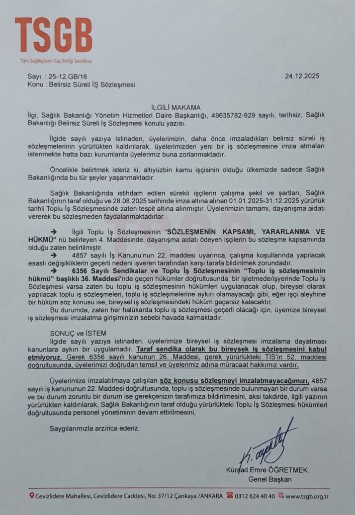 “Üyelerimize yeni iş sözleşmesi adı altında dayatılan sözleşme hukuka aykırıdır. Kabul etmiyoruz. Üyelerimizi de idare ile tartıştırmiyoruz. Doğrudan üyelerimizin adına gereken girişimleri sendika olarak biz yapıyoruz.